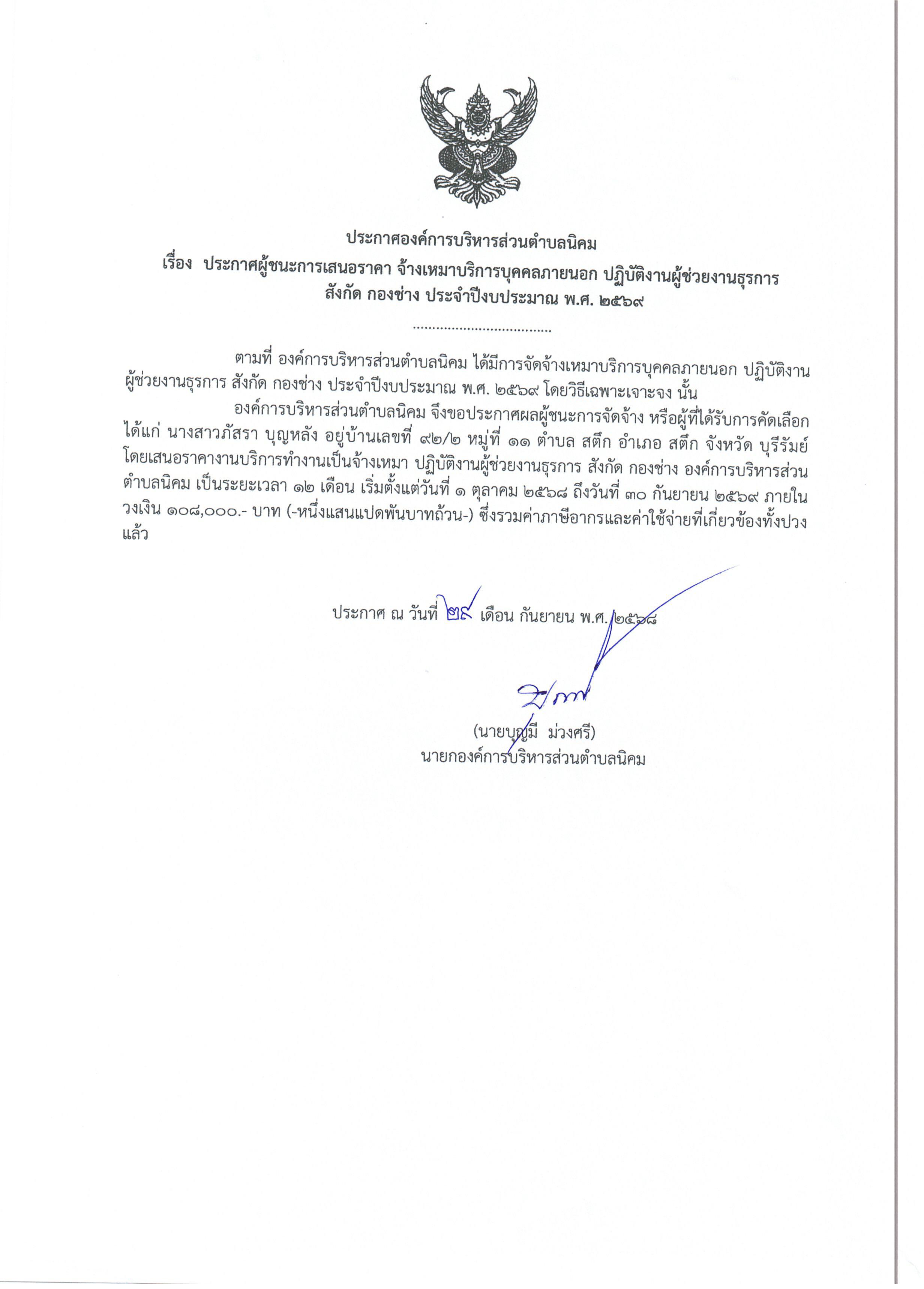 ประกาศผู้ชนะการเสนอราคา จ้างเหมาบริการบุคคลภายนอก ปฏิบัติงานผู้ช่วยงานธุรการ สังกัด กองช่าง ประจำปีงบประมาณ พ.ศ. ๒๕๖๙