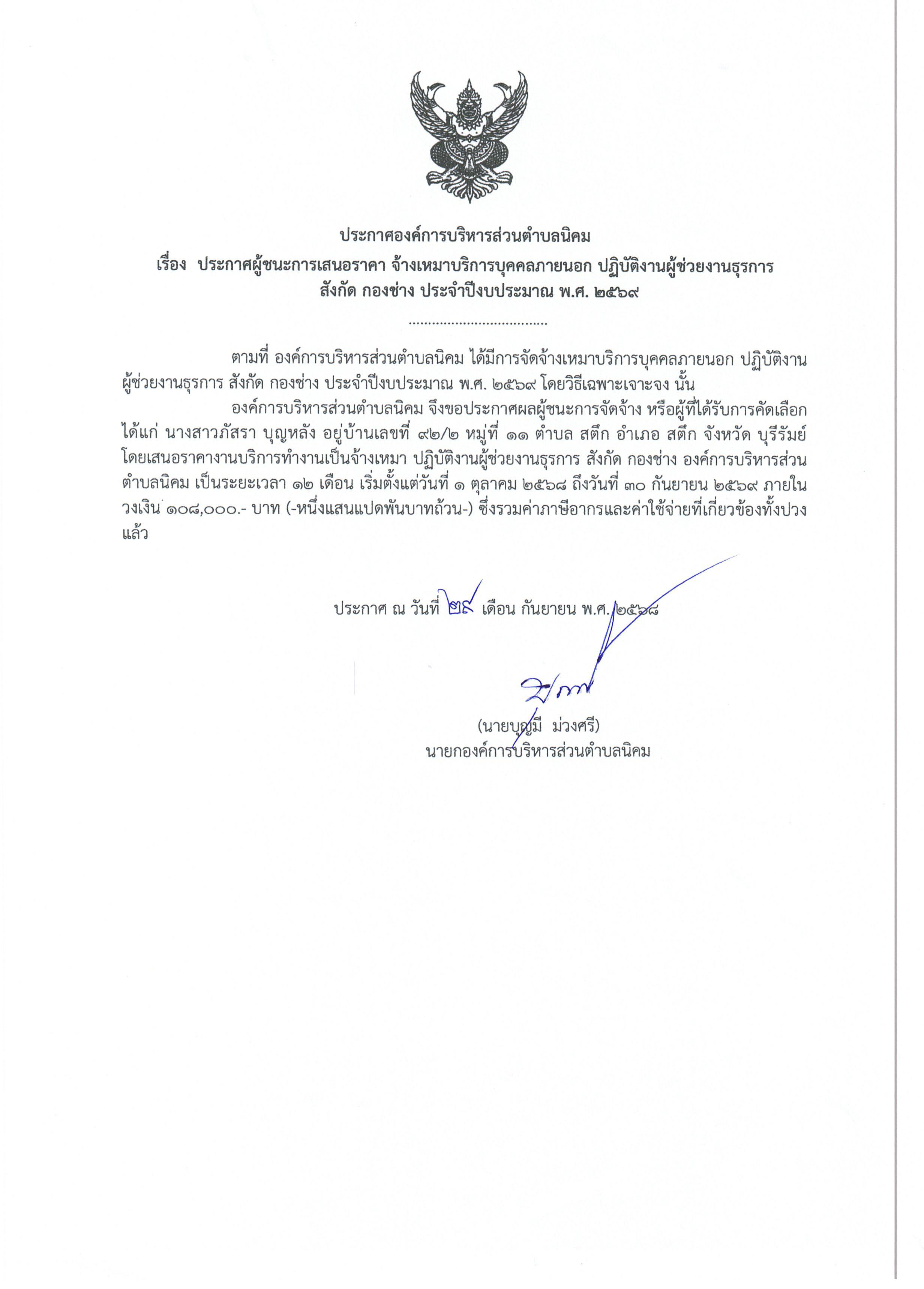 ประกาศผู้ชนะการเสนอราคา จ้างเหมาบริการบุคคลภายนอก ปฏิบัติงานผู้ช่วยงานธุรการ สังกัด กองช่าง ประจำปีงบประมาณ พ.ศ. ๒๕๖๙