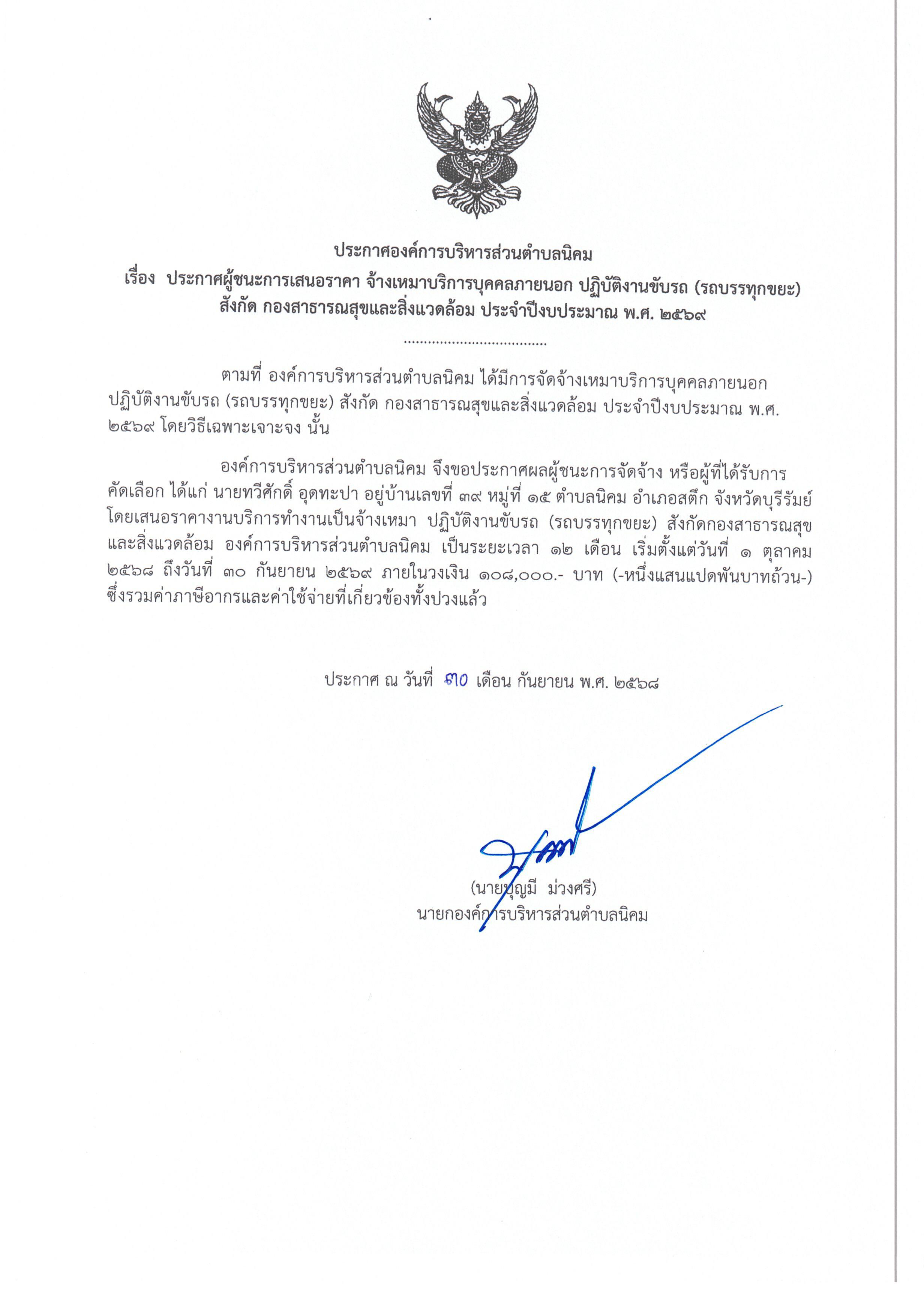 ประกาศผู้ชนะการเสนอราคา จ้างเหมาบริการบุคคลภายนอก ปฏิบัติงานขับรถ (รถบรรทุกขยะ) สังกัด กองสาธารณสุขและสิ่งแวดล้อม ประจำปีงบประมาณ พ.ศ. ๒๕๖๙