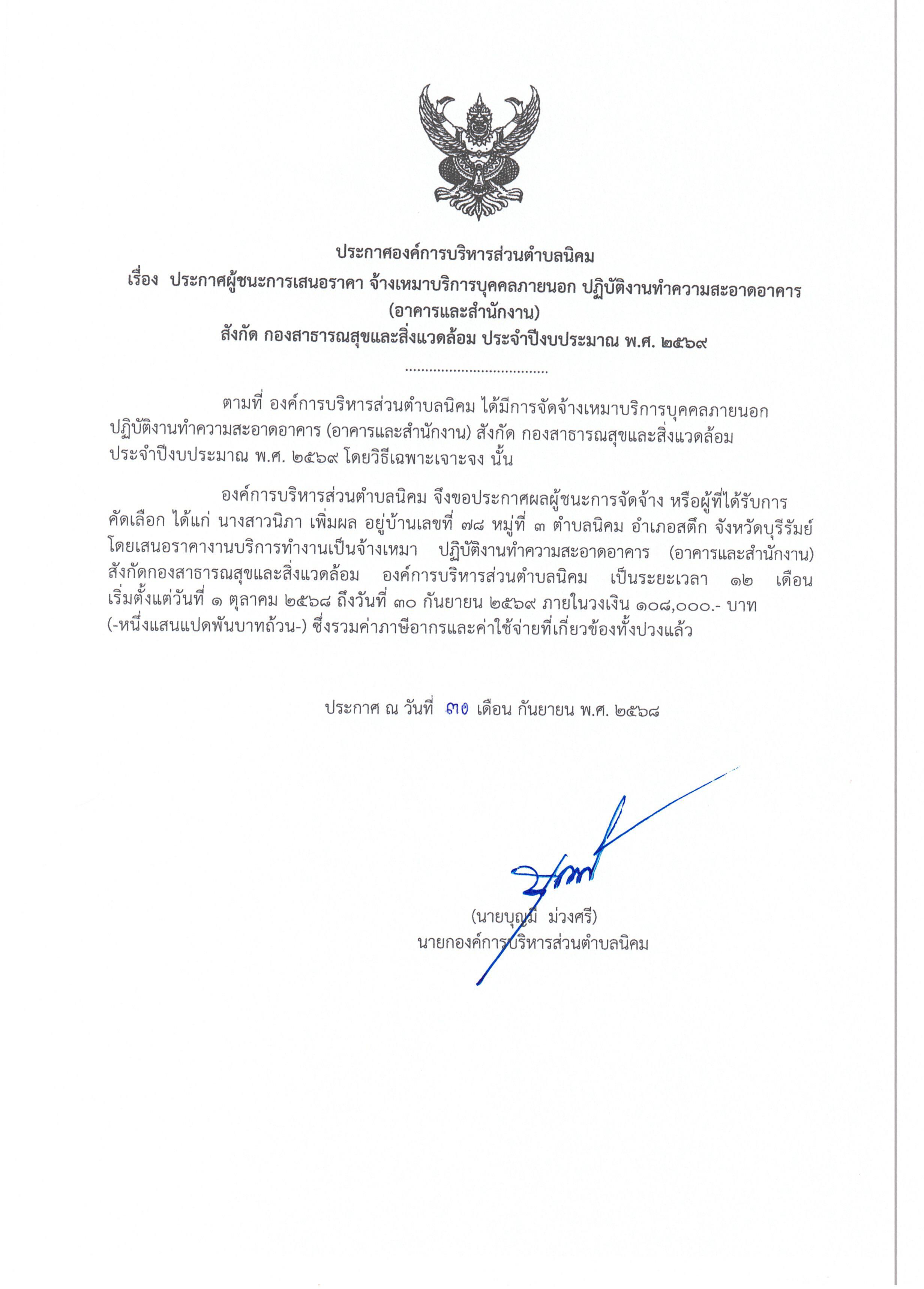 ประกาศผู้ชนะการเสนอราคา จ้างเหมาบริการบุคคลภายนอก ปฏิบัติงานทำความสะอาดอาคาร (อาคารและสำนักงาน) สังกัด กองสาธารณสุขและสิ่งแวดล้อม ประจำปีงบประมาณ พ.ศ. ๒๕๖๙