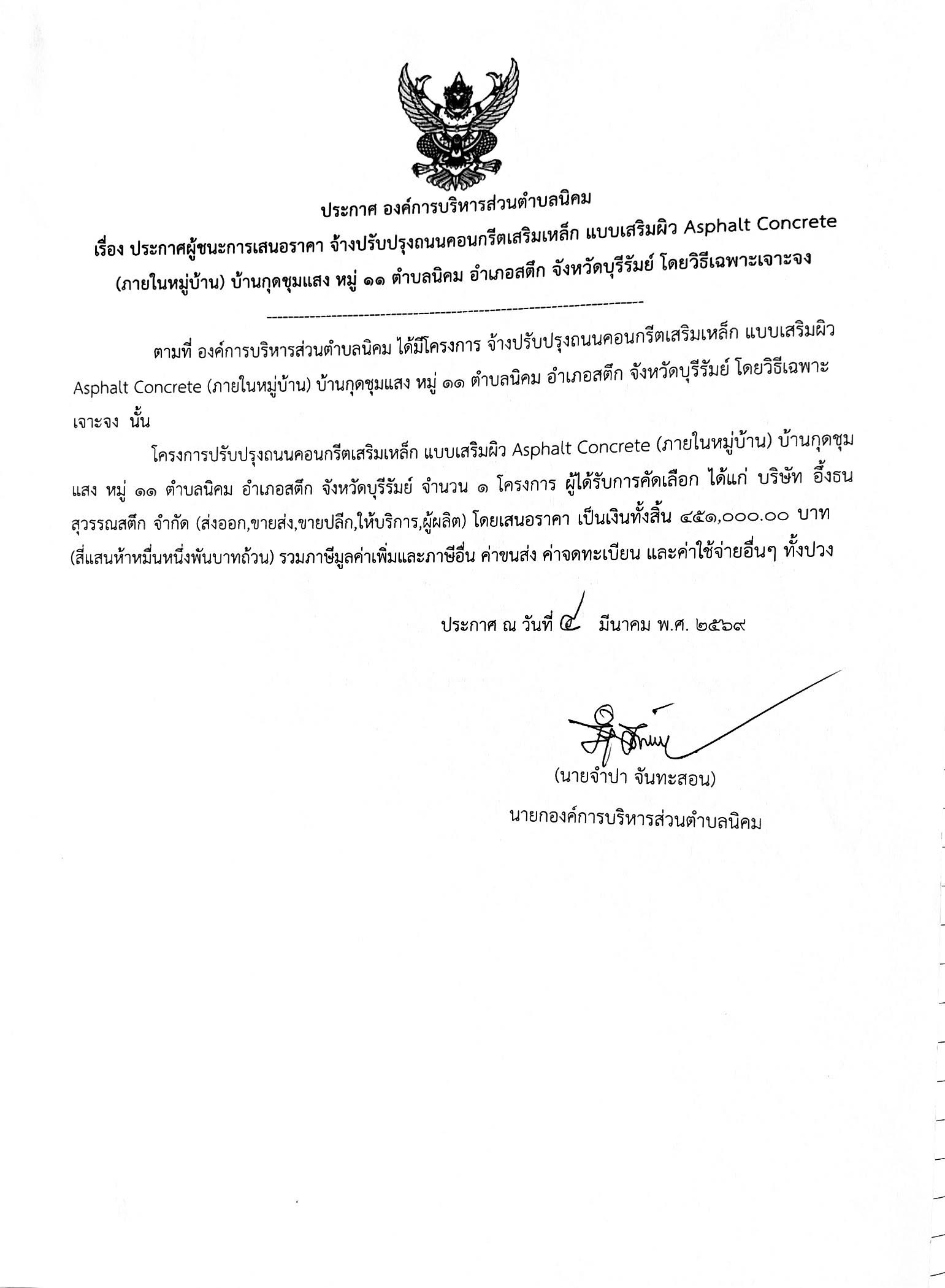 ประกาศผู้ชนะการเสนอราคา จ้างปรับปรุงถนนคอนกรีตเสริมเหล็ก แบบเสริมผิว Asphalt Concrete (ภายในหมู่บ้าน) บ้านกุดชุมแสง หมู่ ๑๑ ตำบลนิคม อำเภอสตึก จังหวัดบุรีรัมย์ โดยวิธีเฉพาะเจาะจง